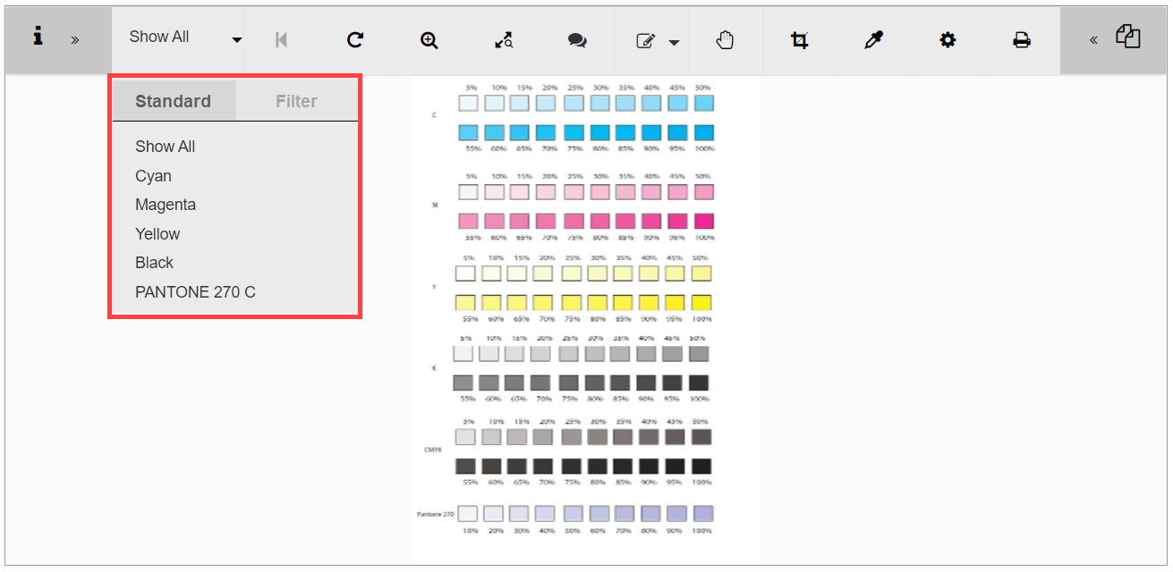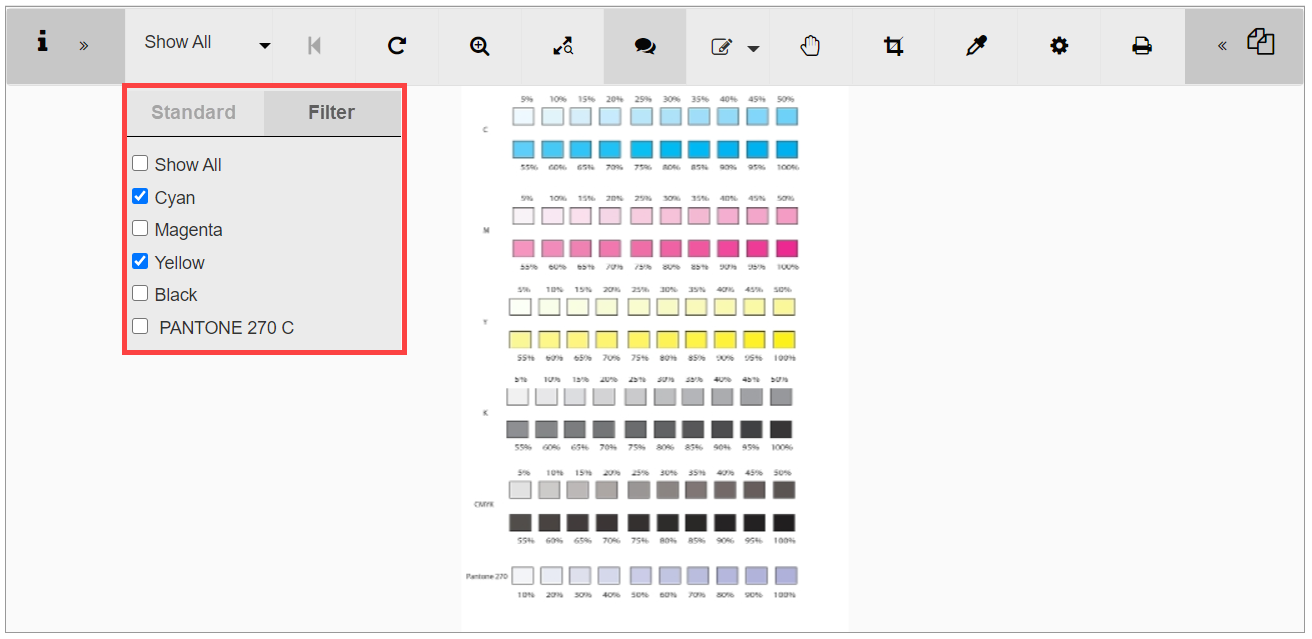 Note: Color separations selected under the Filter tab are displayed in true color.