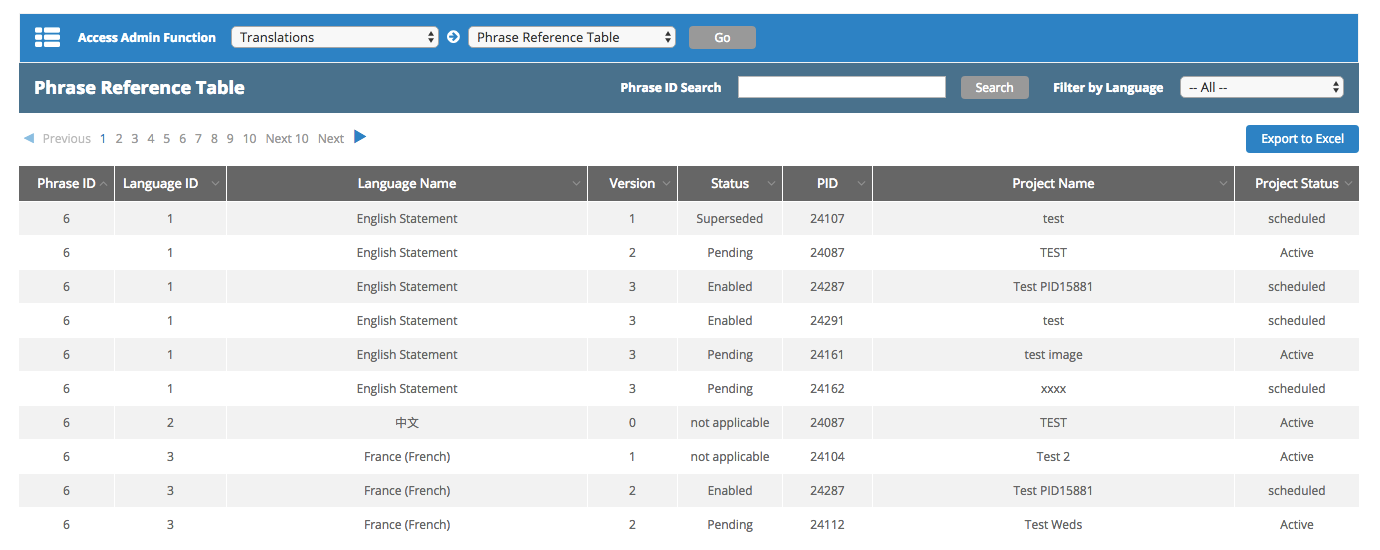 The table can be filtered by Phrase ID and Language. Further manipulation can be done by exporting the table to Excel.